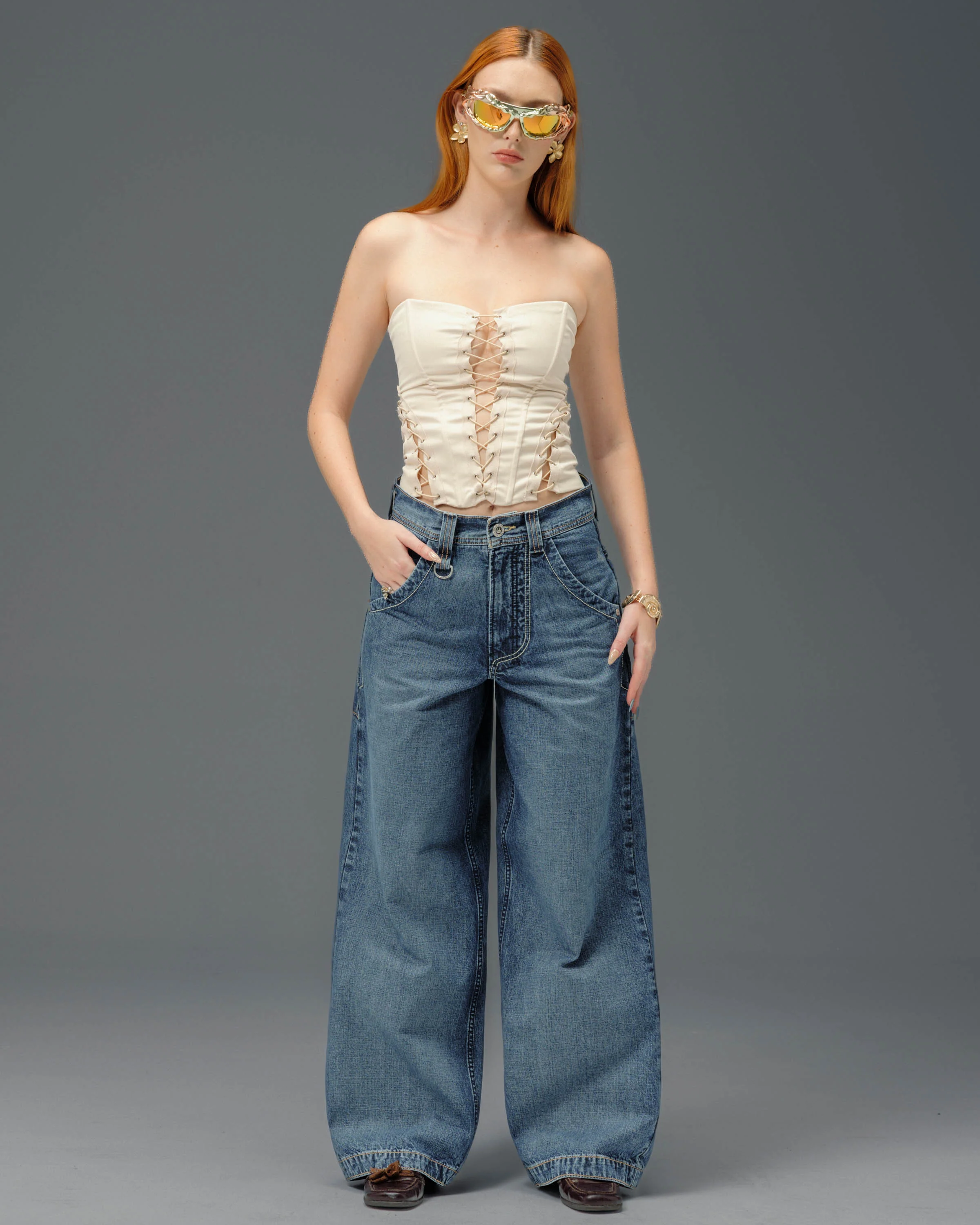 Collector’s item from JNCO’s workwear-inspired line. Hand-Sand Medium Dark Stone Wash, 23" bottom opening. 12.5oz 100% cotton cross-hatch denim with four-thread contrast stitching. 4 back pockets, “JNCO Jeans '85” dragon patch, crown plaque, and chain loops (chain not included). Original “JNCO Royal” embroidery with 80,000 stitches. Collectible matte and gloss flasher included. Limited Edition – very limited stock.